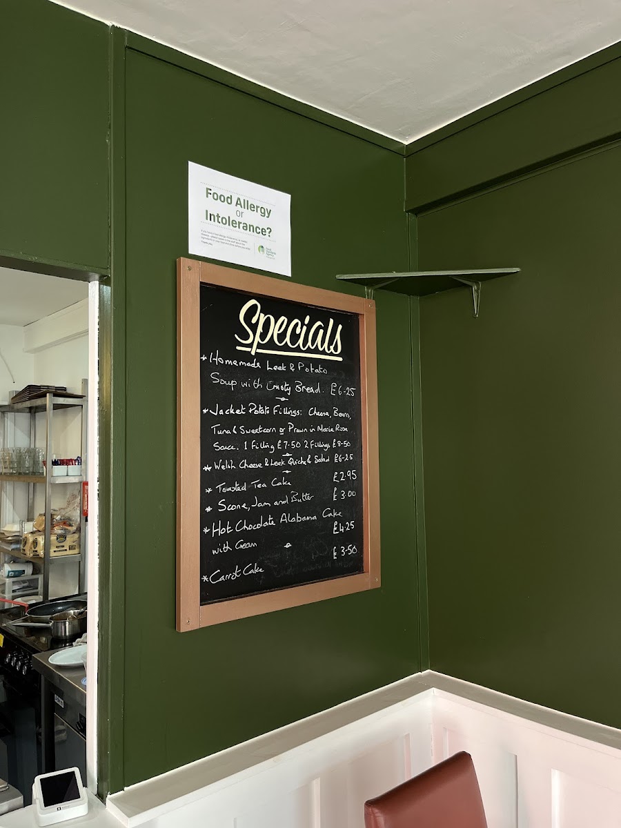 For drinks and lighter refreshments, the menu highlights a frothy hot chocolate and toasted teacake, which are suitable for coffee breaks or casual snack times.